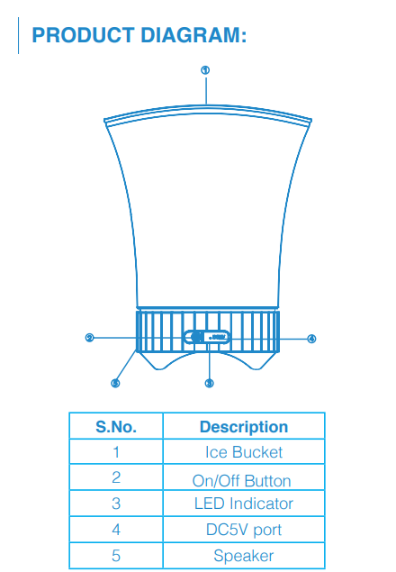 This simple power function applies to the Laser Ice Bucket Speaker with LED Lights (SPK-ICEBUKLED).