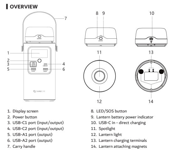• USB-A1/A2 (up to 18 W each) – phones and gadgets.Charging starts automatically; the LCD shows output status.