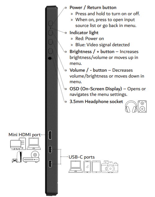 If no image appears, confirm that the correct input source (HDMI or USB-C) is selected and your device is powered on.