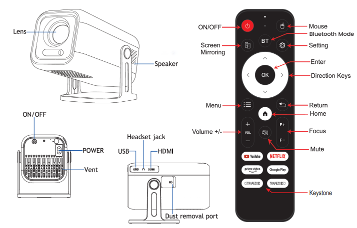 Based on the device diagrams in the manual, the Laser Smart Projector Outdoor Cinema 144 inch includes the following controls and ports: