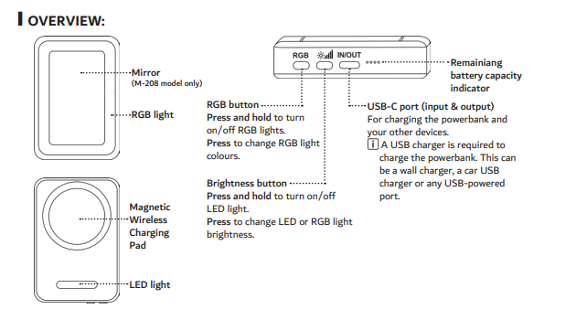 The Laser 5000mAh Magnetic Power Bank Mirror RGB (Full Product Name) includes RGB lighting that can be controlled using the RGB button.
