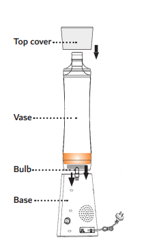 Unpack all parts carefully, including the lamp base, G9 bulb, vase, top cover, and AUX cable.
