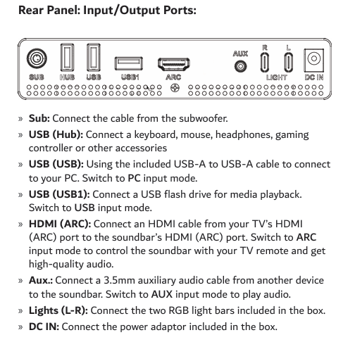 - Connect the included USB-A to USB-A cable from your PC to the USB (USB) port on the soundbar.