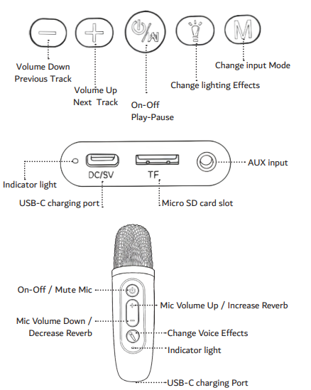 The Laser Mini RGB Karaoke Speaker with 2 Wireless Microphone - Blue and Pink variants lets you change the lighting effects using the lighting button.