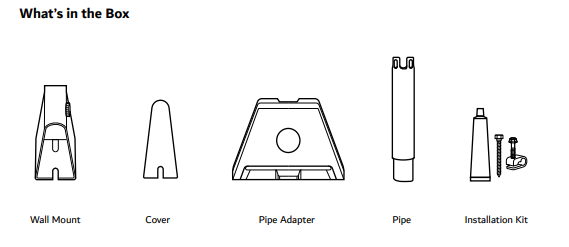 - The box includes the wall mount, cover, pipe adapter, pipe, install kit, and user manual.
